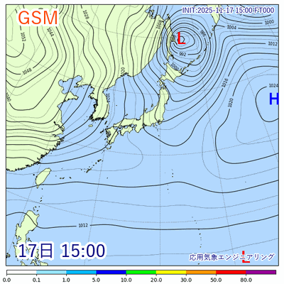表示要素は、海面更生気圧(等圧線)と、降水量(表示時刻の前6時間積算値)です。